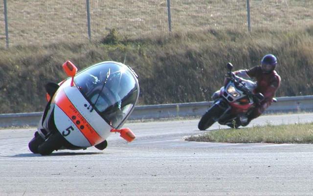 Et sur celle-là tu visualises mieux, avec sur circuit l’Ecomobile suisse, la plus aboutie et “industrielle” des FF (motorisation BMW), comment le centre de gravité machine et pilote est plus bas que sur une moto classique.