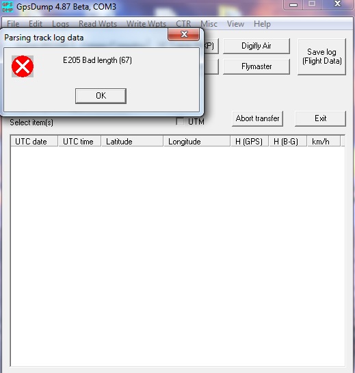 J’ai essayé avec toutes les versions de gps dump mais quand je sélectionne ma trace (j’ai un flymaster nav), voilà: