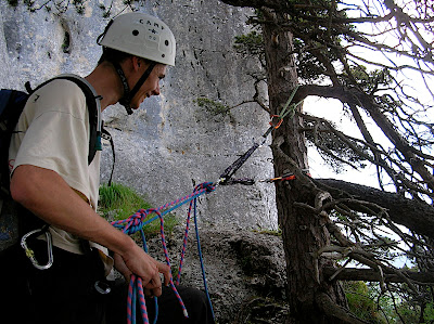 Mais voilà… Comme me disait Stéphanie, c’est souvent au moment de la descente que les galères commencent. Et comme en plus on a perdu le deuxième feuille du topo dans la montée :clown: , on choppe nos téléphones pour essayer de trouver quelqu’un devant un écran d’ordinateur. On se fait expliquer la descente, on rappel, on comprends pas, on se refait expliquer… Bon, ça doit être ce rappel là… C’est partit. En effet, on retrouve un dernier petit bout à grimper, une arrête finale aérienne et le sentier ! Mais là encore, bizarre… Le sentier s’arrête brutalement sur un arbre ou des vieilles sangles ayant servis à installer des rappels trainent encore… Re téléphone, re-explication et nous voici cette fois-ci sur le bon chemin de la descente. Petit coup de fil pour rassurer ceux que l’on avait inquiéter et petit SMS pour charrier celui qui n’a pas voulu venir